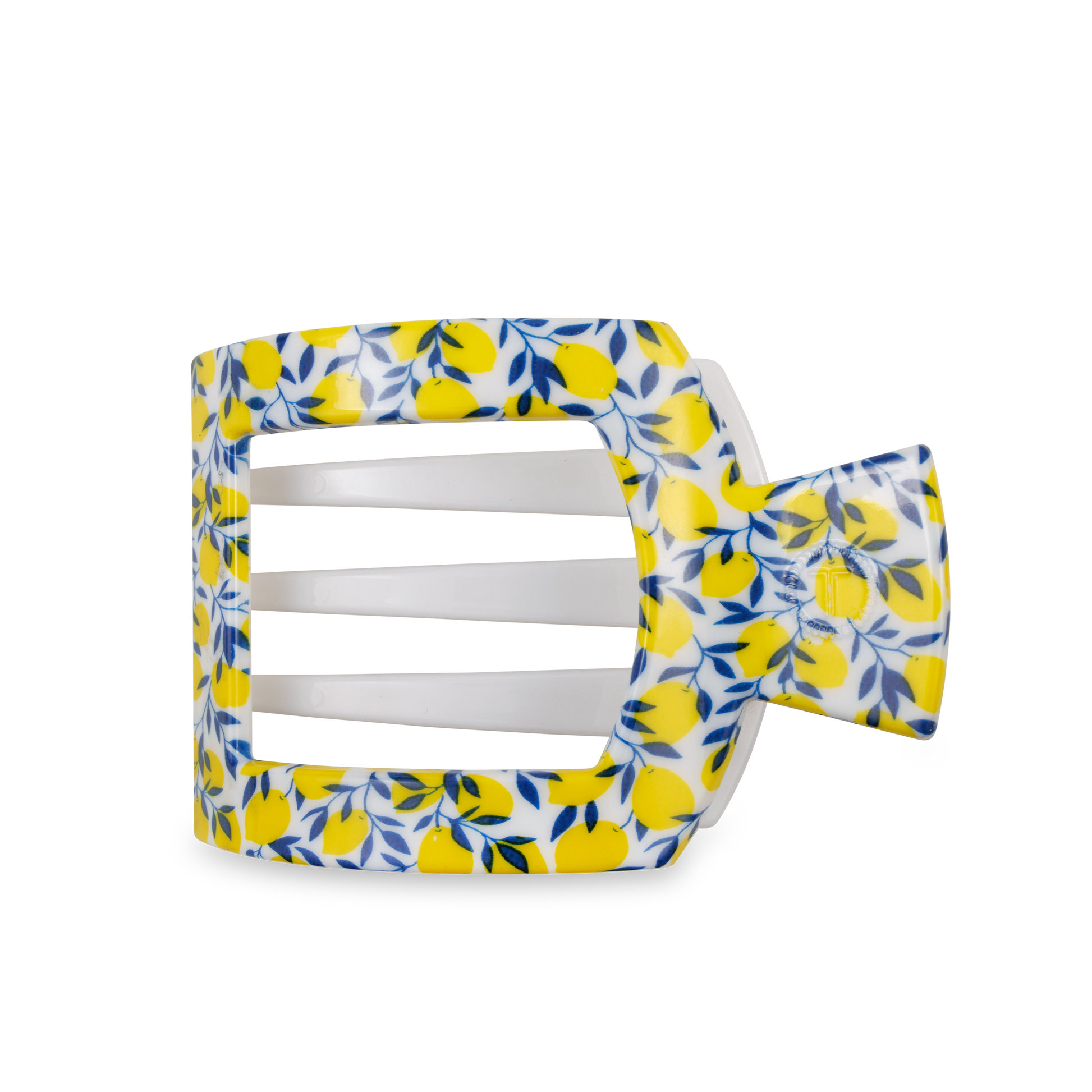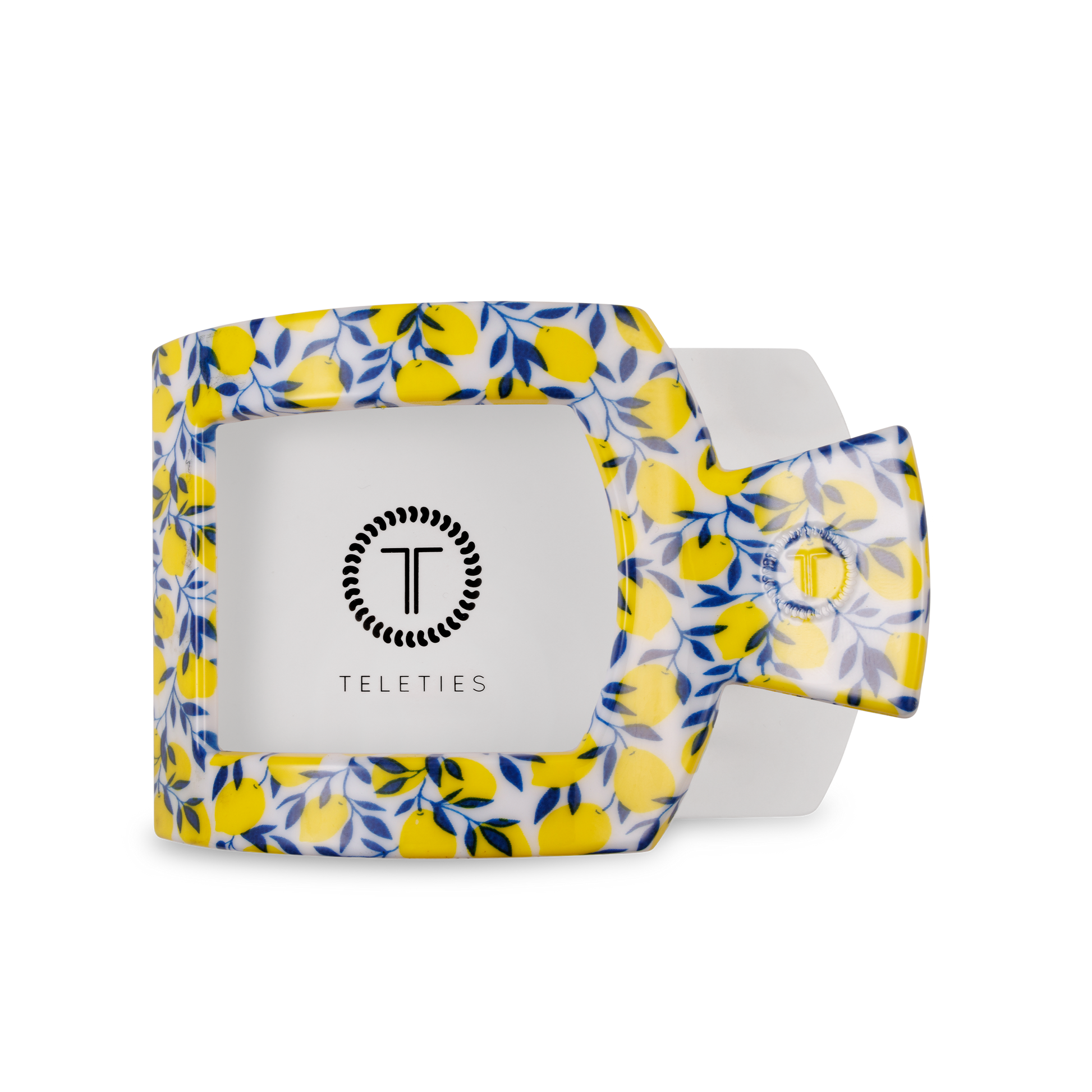 Lay flat and relax with the new TELETIES Limoncello Flat Square Hair Clip with a bold lemon print in yellow and blue. This hair clip is designed to allow you to lay back flat, do yoga, or sit comfortably in a seat with a headrest, and it is made with the same material that is nearly unbreakable.