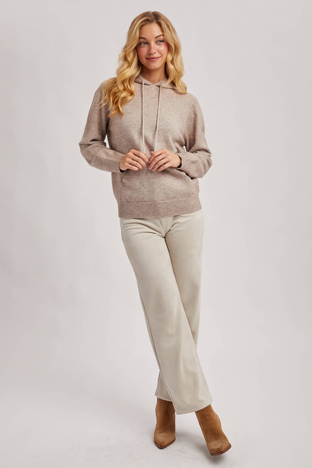 This is a WHOLEGARMENT cozy and elevated knit hoodie. It combines the relaxed silhouette of a classic hoodie with the soft texture of a sweater, featuring an attached hood and functional drawstrings finished with polished, silver-toned metal aglets for a refined touch. A large kangaroo pocket on the front enhances its casual, practical appeal, while the long sleeves and hem are completed with wide ribbed knitting, providing a comfortable, structured fit. The overall design offers a chic and comfortable take on a wardrobe staple.