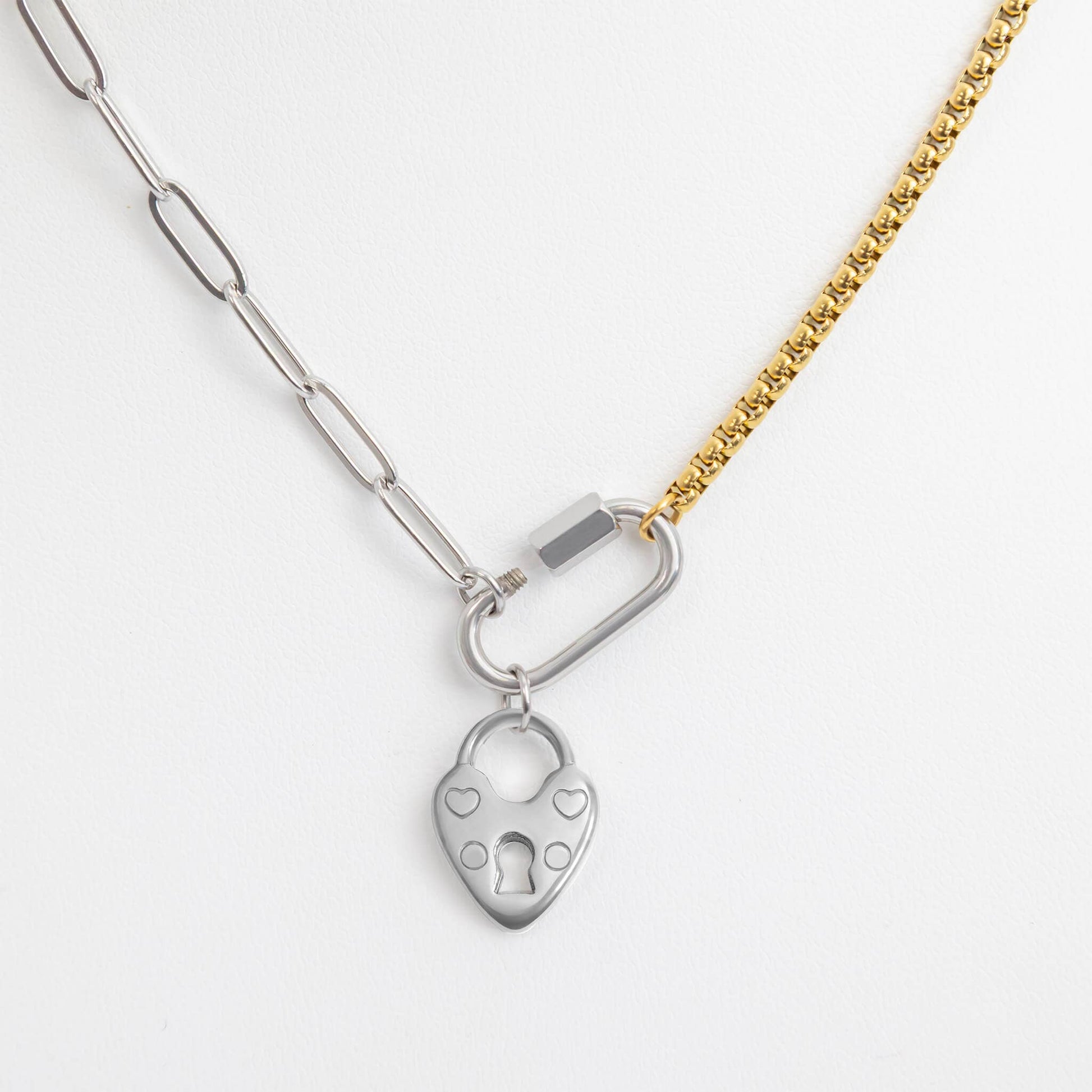 A sleek mixed‑metal statement, this double‑chain necklace pairs a lightweight silver paperclip link with a warm gold box chain for clean contrast, depth, and everyday durability. The modern carabiner clasp doubles as a polished focal point and makes on‑off simple, letting you fine‑tune the drape for solo wear or easy layering. Crafted in hypoallergenic, tarnish‑resistant stainless steel for lasting shine and comfortable daily wear, it moves seamlessly from casual outfits to dressier looks.